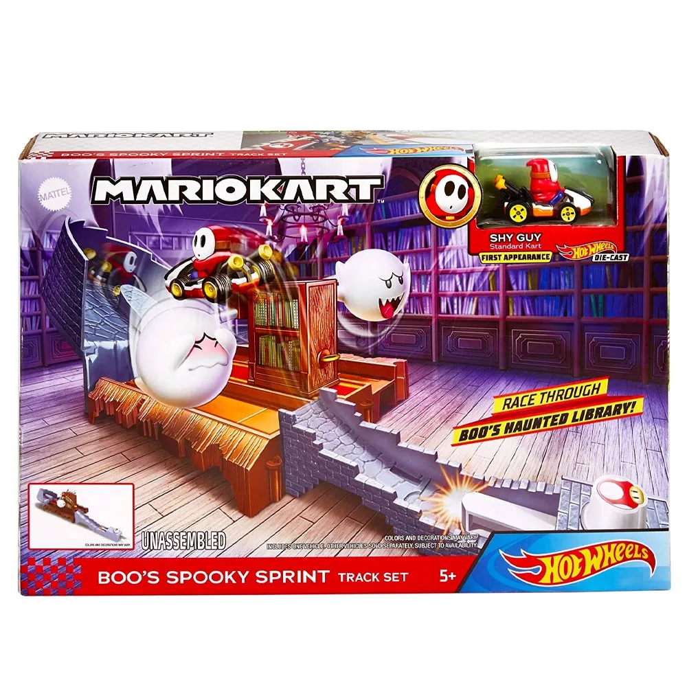 Agora as crianças podem juntar a emoção de Mario Kart com a velocidade de Hot Wheels com o Hot Wheels Mario Kart Conjunto Nemesis Boo's Spooky Sprint da Mattel! Este divertido conjunto inclui uma pista Spooky Sprint Boo com os fantasmas e um carrinho do inimigo Shy Guy! As crianças podem se juntar aos amigos, como no videogame e seus personagens favoritos, deixar a imaginação criar divertidas histórias e competir para ser o piloto mais rápido da pista!
